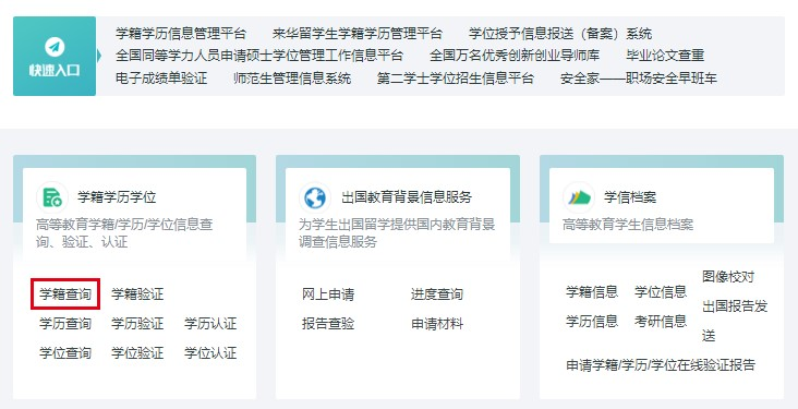 第二步:点击学信网主页左侧“学籍学历学位—学籍查询”选项;
