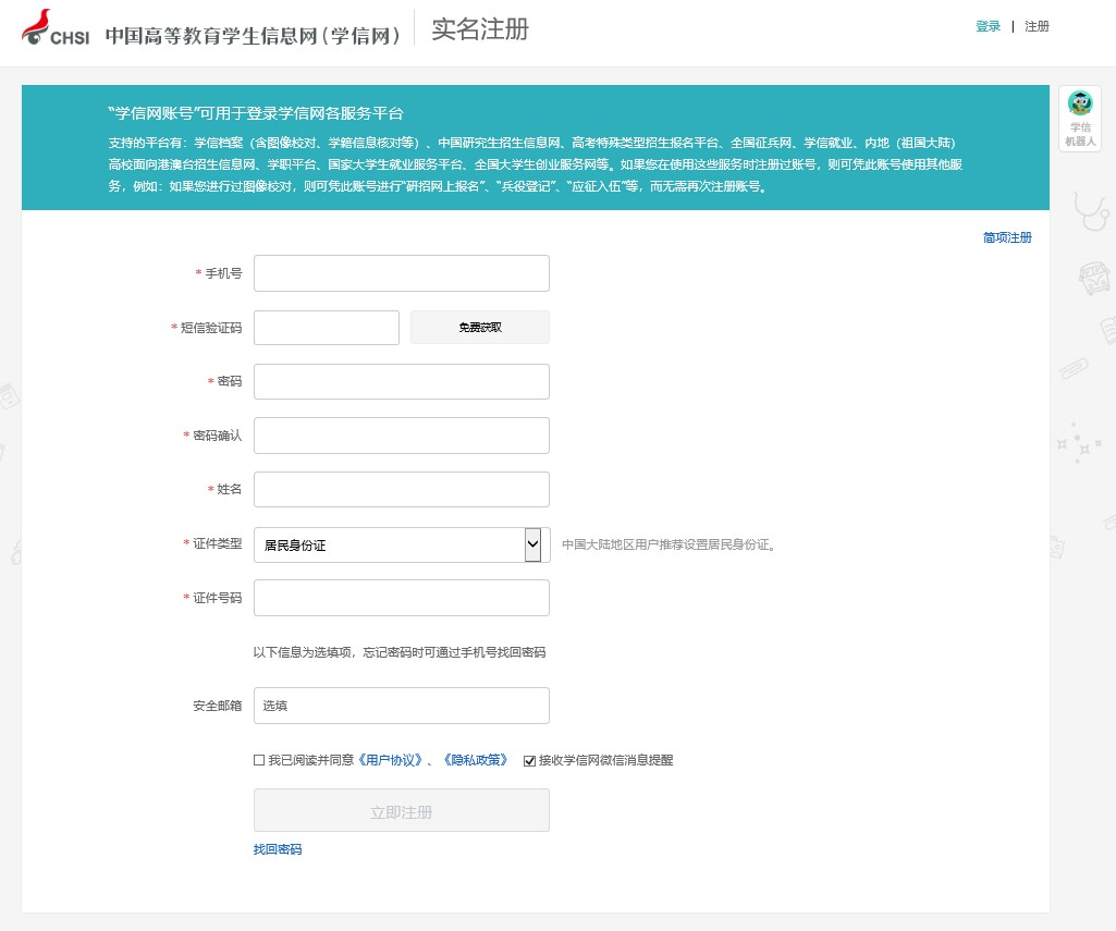 第四步:按网站提示绑定手机号码和证件号码后实名注册学信网;