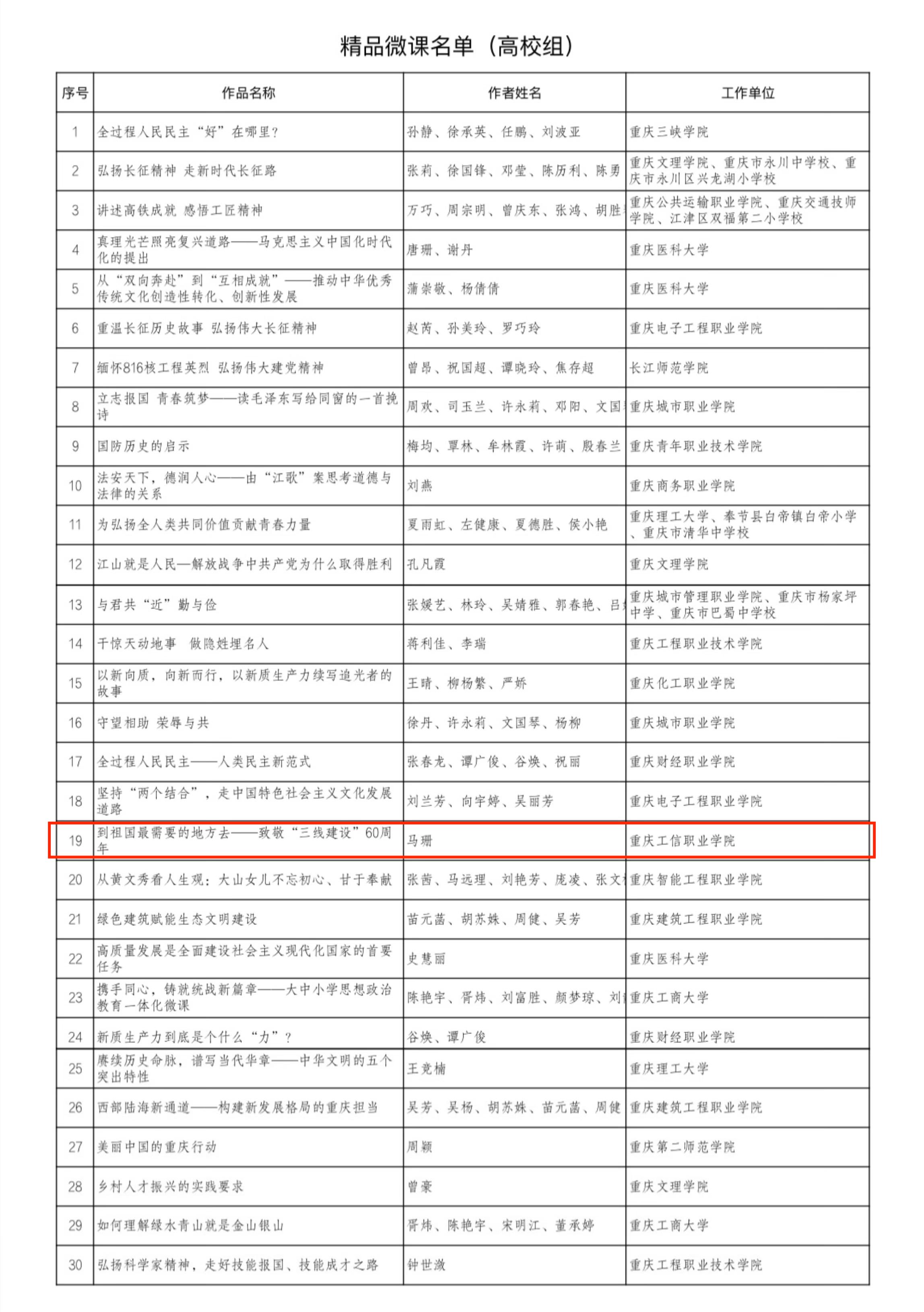 近日,重庆市大中小学思想政治教育一体化建设成果推选展示活动圆满落幕。我校马克思主义学院思政教师马珊的微课作品《到祖国最需要的地方去——致敬“三线建设”60周年》在众多参赛作品中脱颖而出,成功入选展示活动。