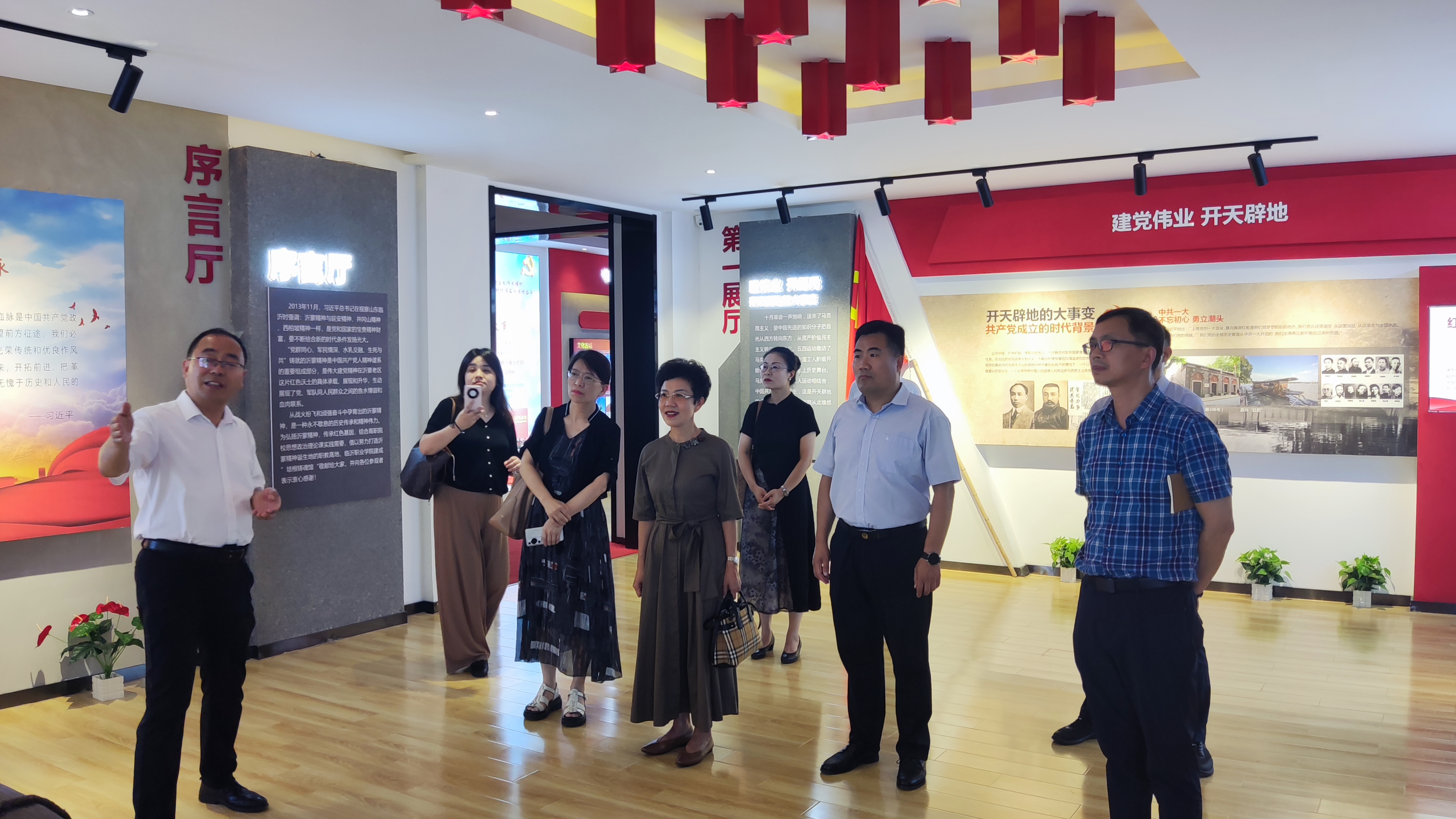 考察团一行第一站来到临沂职业学院。临沂作为中国革命老区,具有深厚的红色文化底蕴,临沂职业学院紧紧依靠当地红色资源,结合学校特色建设了先进的培根铸魂馆、党建思政虚拟仿真中心以及非物质文化遗产传承教育展览馆,考察团一行现场探访了各个展馆及体验中心,临沂职业学院党委副书记、院长安丰和携团队热情接待了考察团一行,双方在交流会上就学校各方面工作进行了深入交流。