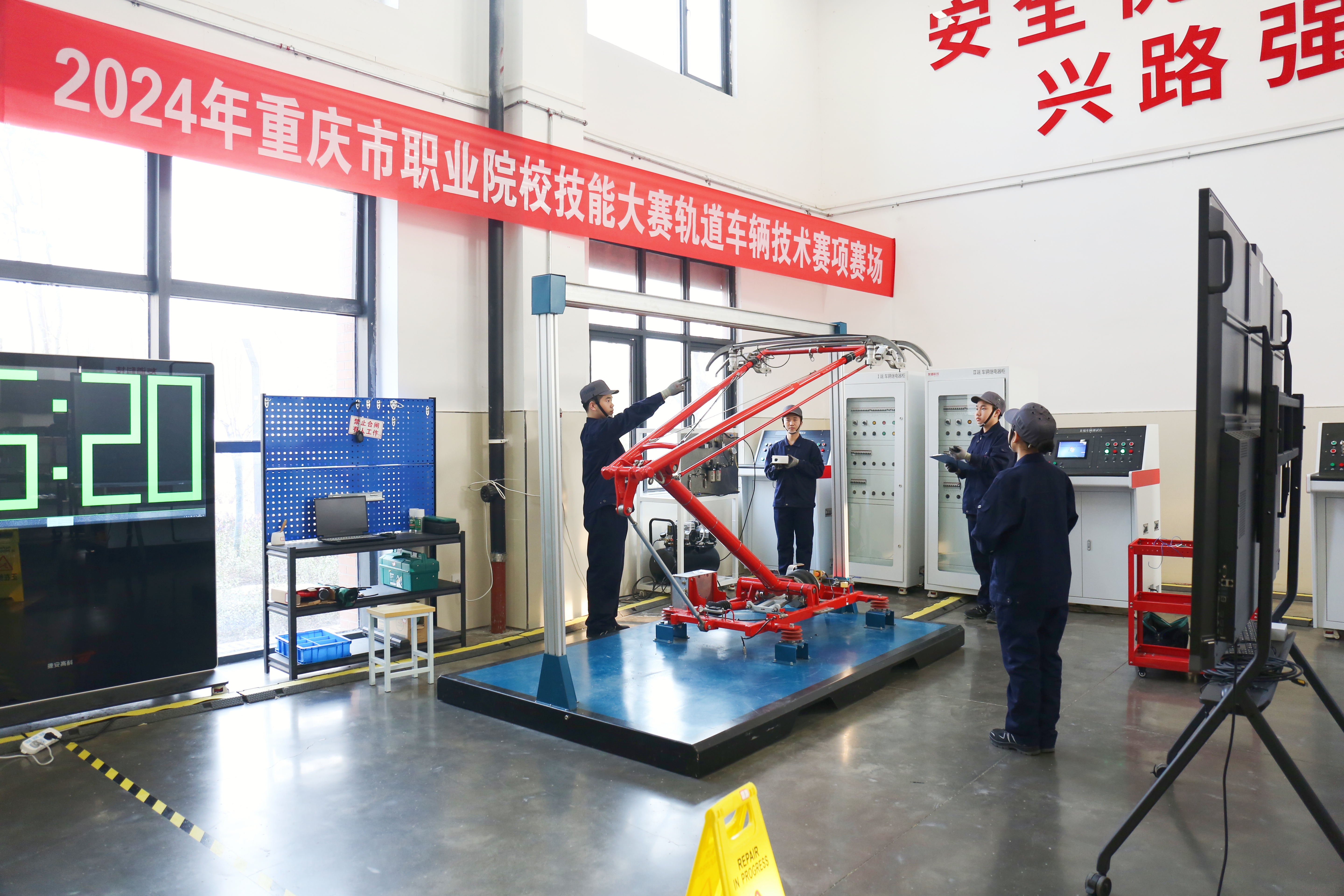 重庆市教育科学研究院教研员付勇、重庆工信职业学院党委委员、副院长柴彬堂、重庆市巴南区教师进修学院教研员李英惠、成都工贸职业技术学院轨道车辆技术专业教授(赛项裁判长)杨福强,重庆工信职业学院药品与环境工程学院负责人龚锋、轨道交通学院负责人杜彩霞等出席了开幕式。在为期2天的赛程里,来自全市11所高职院校的37支参赛队围绕“轨道车辆技术赛项”与“化工生产技术赛项”展开了激烈角逐。