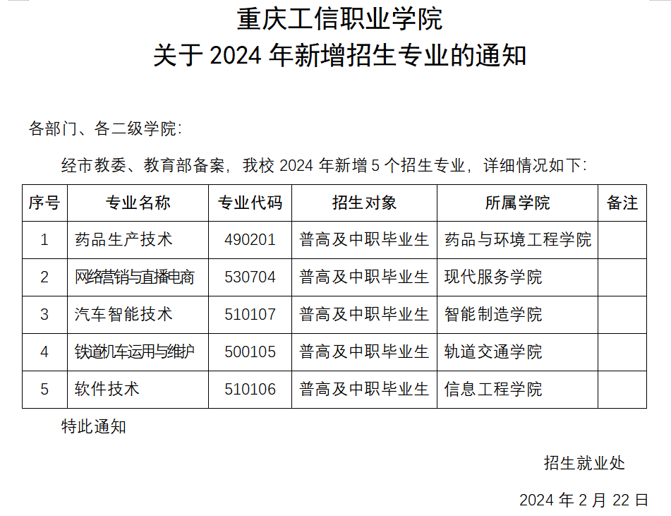 重庆工信职业学院关于2024年新增招生专业的通知