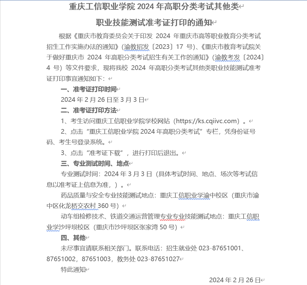 重庆工信职业学院2024年高职分类考试其他类专业职业技能测试准考证打印通知