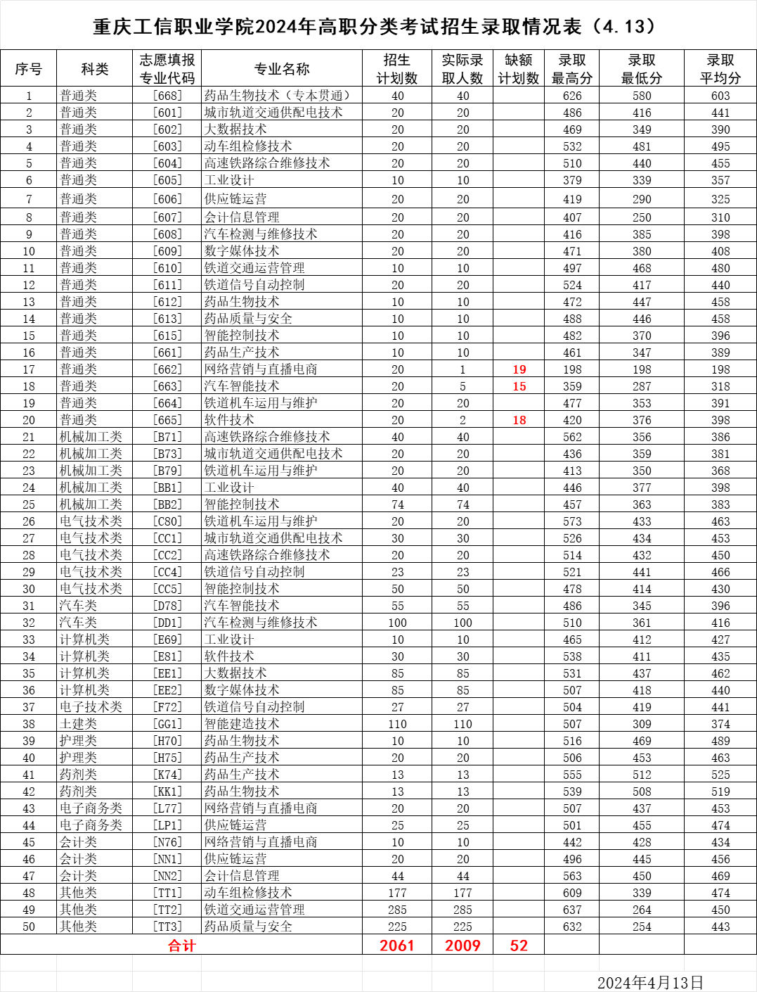 重庆工信职业学院 关于公布2024年高职分类考试录取结果的通知