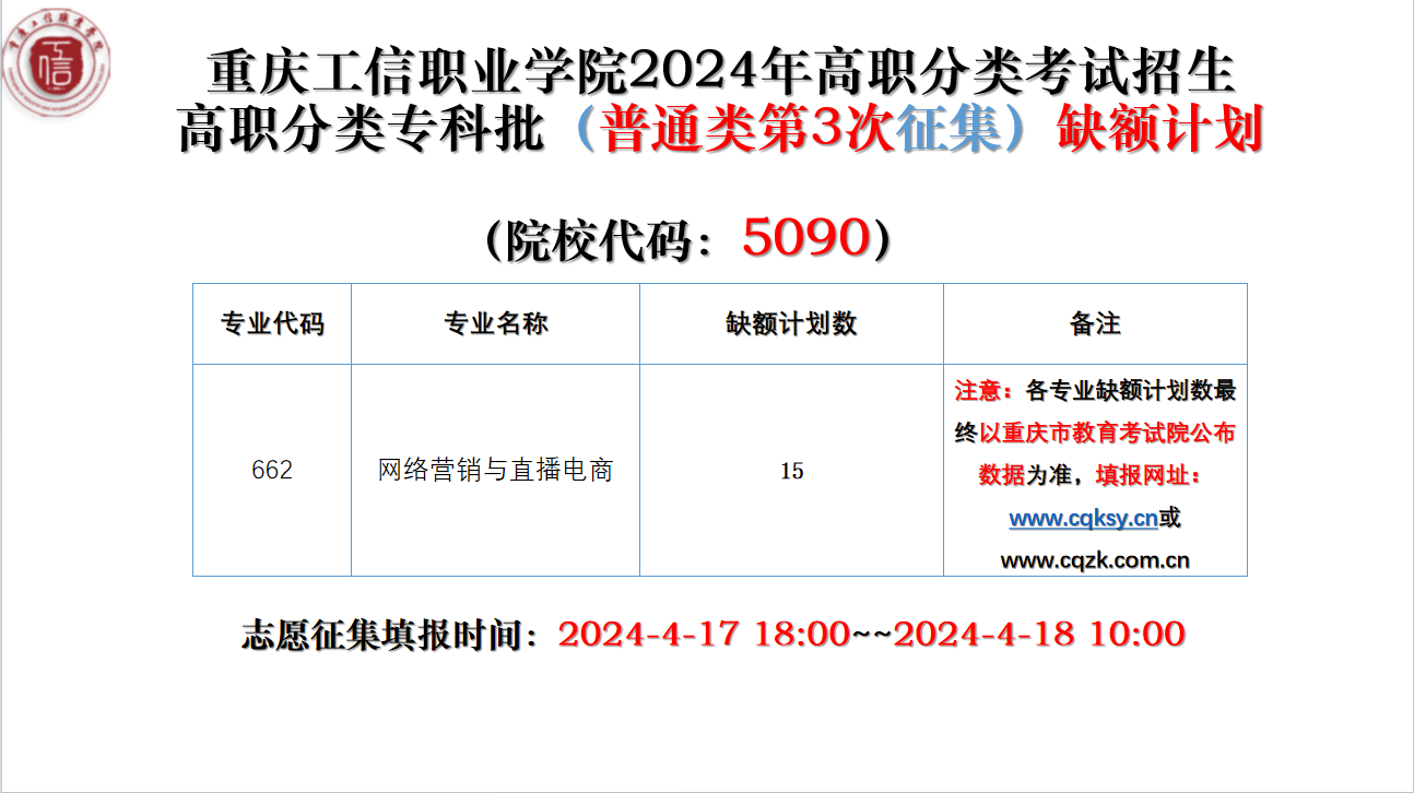 重庆工信职业学院2024年高职分类考试招生高职分类专科批(普通类第3次征集)缺额计划